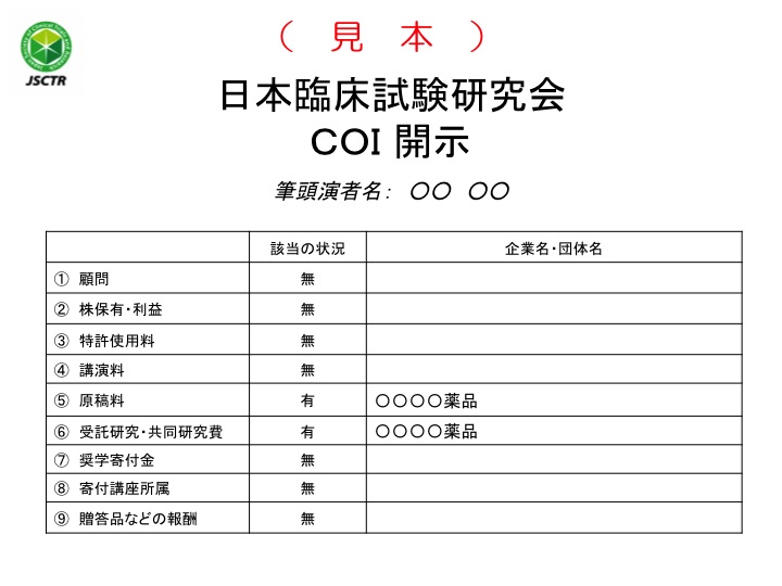 ・発表時の筆頭演者におけるCOI開示にご協力をお願いいたします。 COIの有無に関わらず、下記に沿って発表スライドに記載してください。 ▶開示すべきCOIがない場合 冒頭スライドの下段に、「筆頭演者のCOI開示:開示すべきCOI関係にある企業などはありません」と 簡潔に記載してください。 ▶開示すべきCOIがある場合 2枚目のスライドにて、申告書(下記フォーマット参考)に沿って記載してください。 >>COI開示基準詳細(pdfデータ) >>COI開示フォーマットダウンロード(pptデータ)